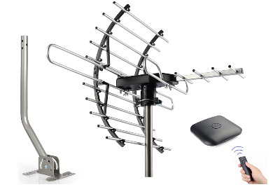The package includes a mounting pole, brackets, and all necessary installation hardware. The wireless remote receiver connects between the antenna and your television, drawing power from a USB port or AC adapter. Setup requires both physical installation and remote pairing.