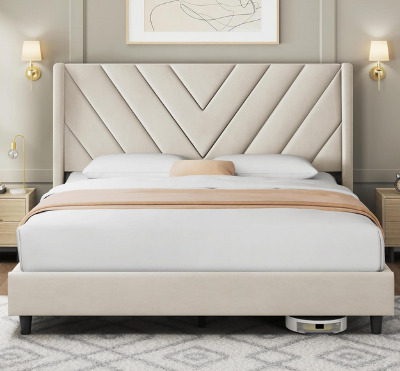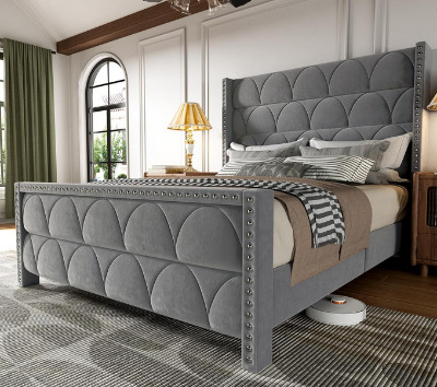 This Queen Size Bed Frame features an impressive 56-inch tall wingback headboard that creates a dramatic focal point in any bedroom. The velvet upholstered design delivers both visual luxury and practical comfort.
