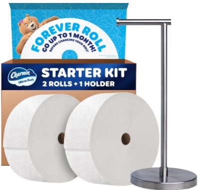 Product Description: The Forever Roll contains the equivalent of 24 regular rolls in each large roll. Charmin’s patented holder mounts easily to walls, keeping the oversized roll secure and accessible. The ultra-soft texture provides the comfort Charmin is known for, while the extended roll length means fewer replacements.